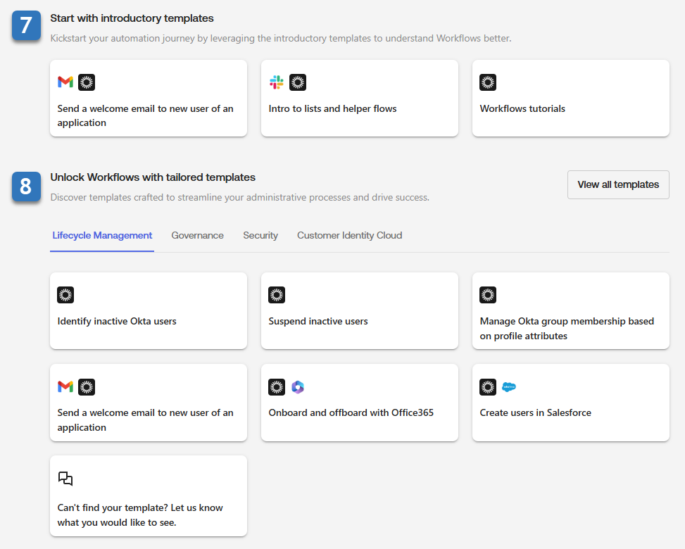 Templates: Search and view the available Okta Workflows templates. You can copy a template to your org and easily modify it to meet your specific business needs. See Workflows templates.